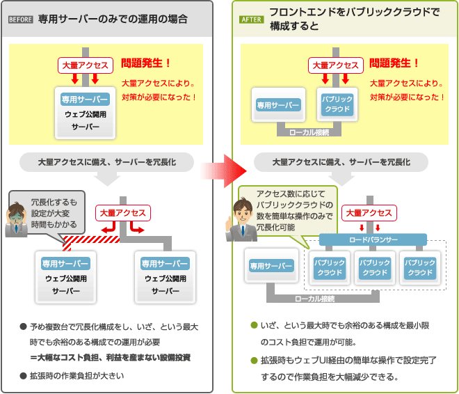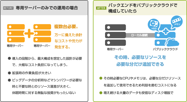 ウェブフロントエンドをパブリッククラウドでロードバランサー+ウェブサーバーのオートスケールアップ&アウトを行い、高速処理が必要なDBサーバーは専用サーバーで構成。