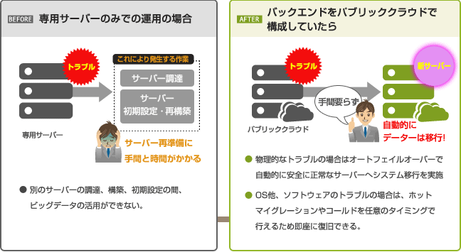 フロントのウェブ+DBは専用サーバーの複数構成で、日々の大量のログやDBのバックアップをパブリッククラウドに移動してビッグデータを解析・分析して活用したい。